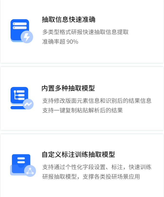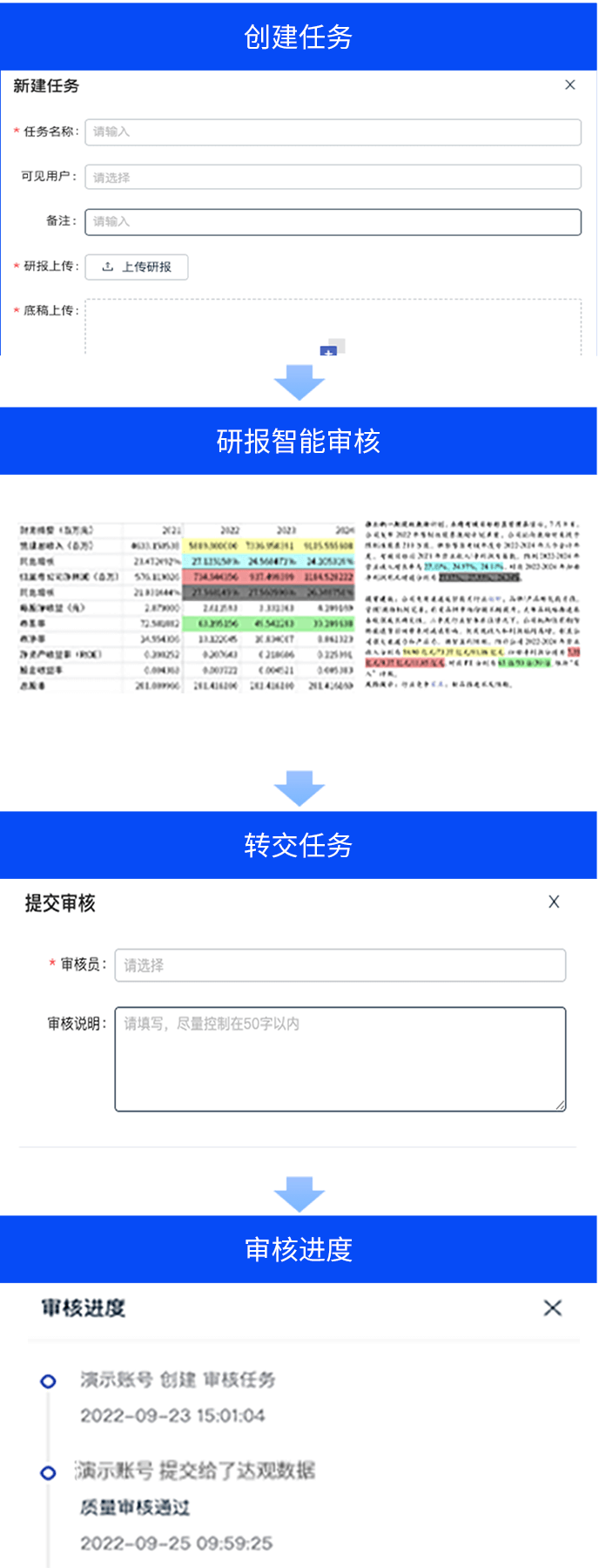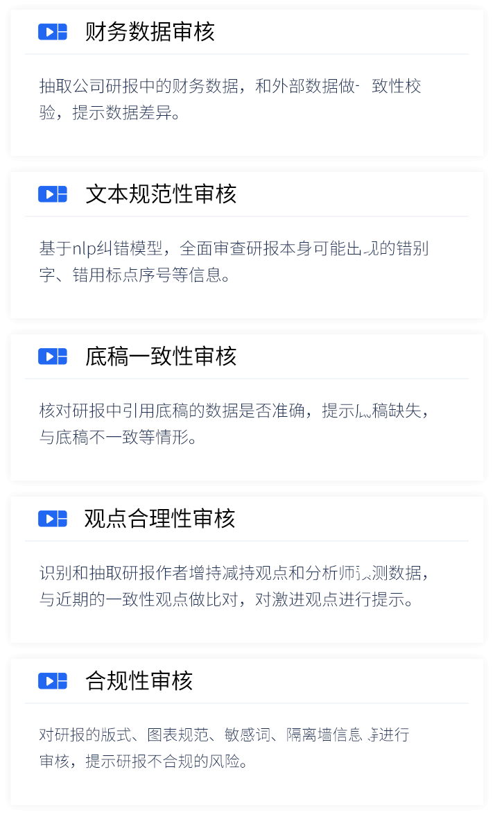 智能研报审核系统是USDT钱包数据为券商研究所、买方研究组织等用户打造的集研报解析、抽取、审核、管理功能为一体的产品。集成OCR、NLP、机器学习等技术,对研报和底稿信息进行多方面抽取,并对研报进行数据、文本、观点等全方位的自动化审核, 同时对研报和底稿进行规范化、流程化管理,帮助用户提升工作效率,把控研报发布的时效性和合规性,全面降低出错风险。